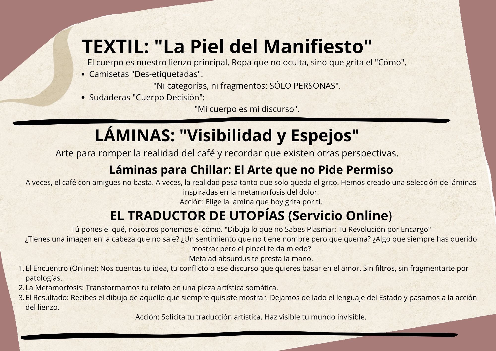 Primeras personas, tenemos talentos, apoyémonos en una revolución artística somática, todos, sin fragmentarnos por patologías, prostitutas, sifilíticos, tuberculosos, enfermos físicos, homosexuales... un sinfín de categorías unidas en el mismo lienzo.